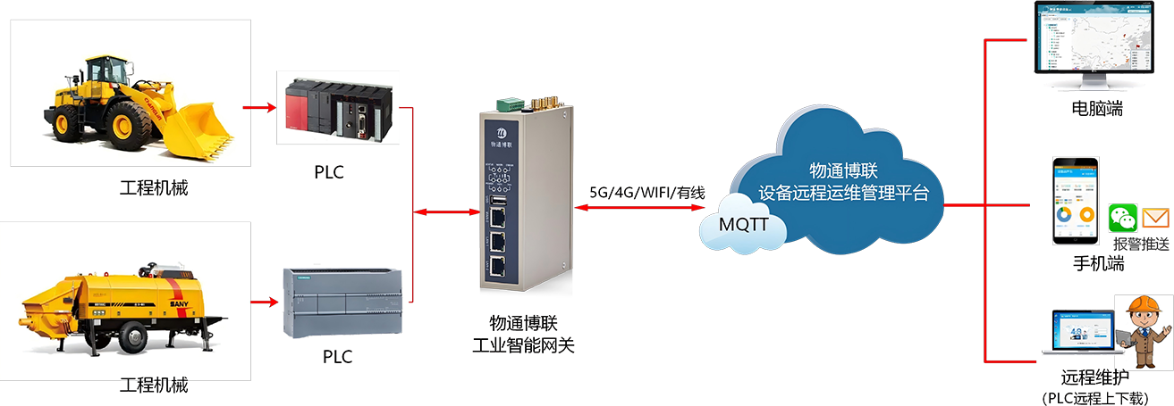 顺利获得777盛世国际的工业智能网关,连接工程机械设备的控制器、传感器等设备,实时采集设备的位置信息、运行状态(如工作、空闲、故障等)、运行参数(如发动机转速、油压、水温等)、油耗等数据。将采集到的数据传输至设备运维管理平台,平台对数据进行分析和处理。当设备出现故障时,及时发出预警,并顺利获得777盛世国际设备维护快线进行远程维护,提高维护效率,降低运维成本,实现设备全生命周期数字化管理。