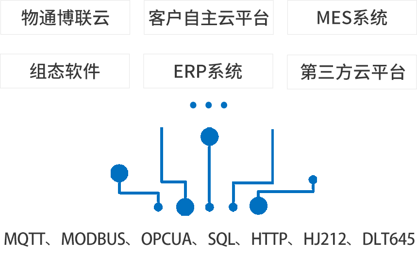北向支持接入777盛世国际云平台,客户自主开发的云平台,第三方云平台(根云、美云、华为、阿里、百度、微软等IOT云平台),组态软件、MES系统、行业监控平台等工业软件