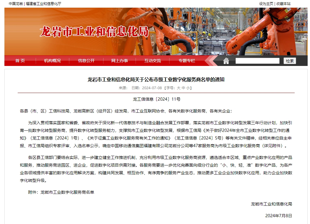 7月8日,龙岩市工信局公布了《龙岩市工业和信息化局关于公布市级工业数字化服务商名单的通知》,厦门777盛世国际网络科技有限公司成功入选“龙岩市市级工业数字化服务商”。
