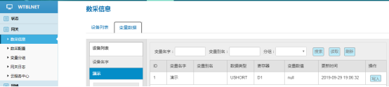 数采配置(设备信息+变量参数)完成后,重启采集程序并生效配置,即可在:数采信息---变量数据---设备名称中看到采集上来的数据。