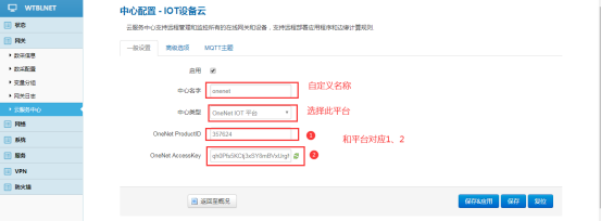 中心类型选择OneNET IOT平台,”OneNET ProductID”和”OneNET AccessKey”要分别与平台上的“产品ID”、“access_key”一致。