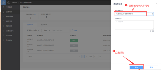 2、平台上添加网关(设备)