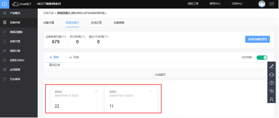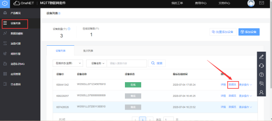 可进入OneNET平台的对应产品中获取网关云服务中心所需要填写的ID和KEY。