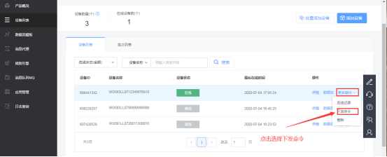 可以在设备列表中选择对应网关更多操作中的下发命令