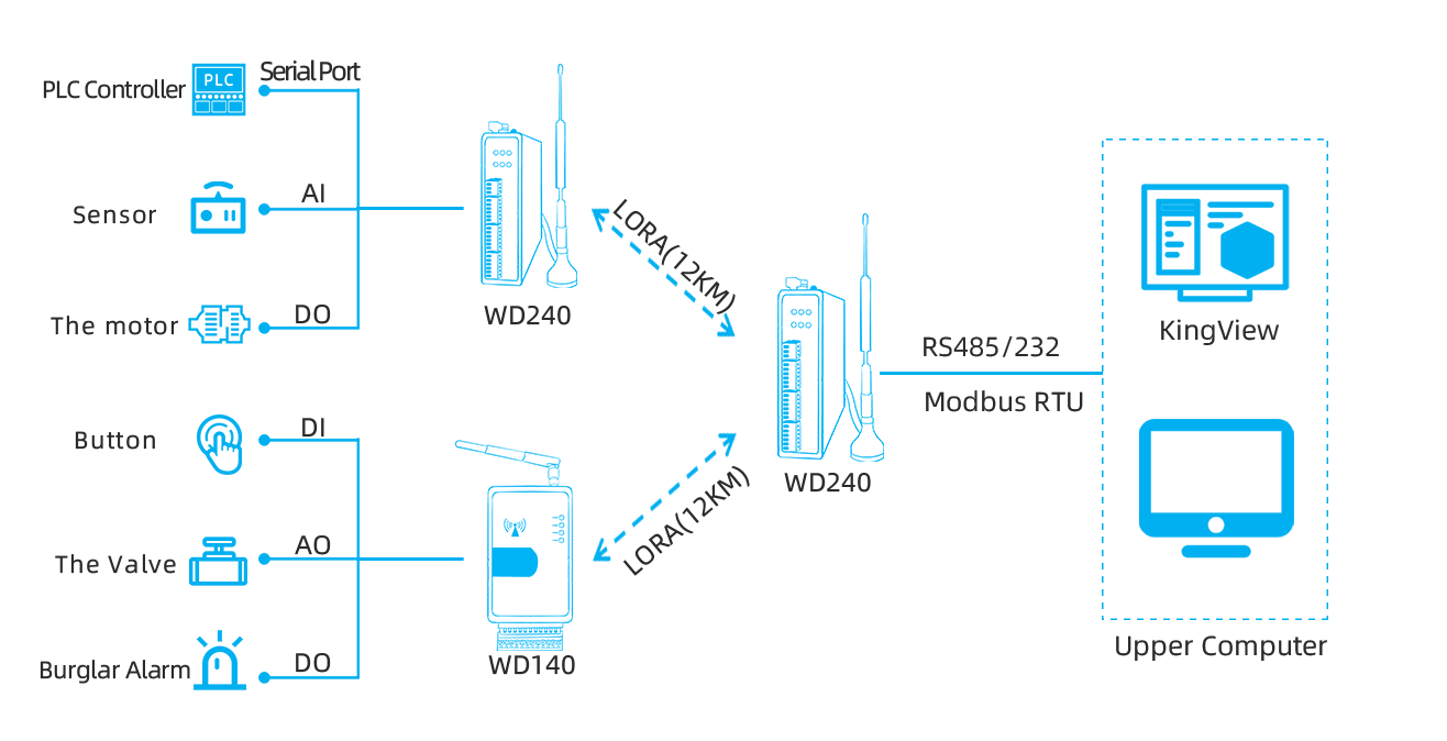 WideIOT·WD Data Terminal mainly realizes the acquisition and control of digital DI, DO, analog AI, and AO of on-site industrial equipment, and realizes the functions of LORA local networking and 4G data cloud, so as to realize Data acquisition and control of field sensors, actuators, indicator lights, etc.