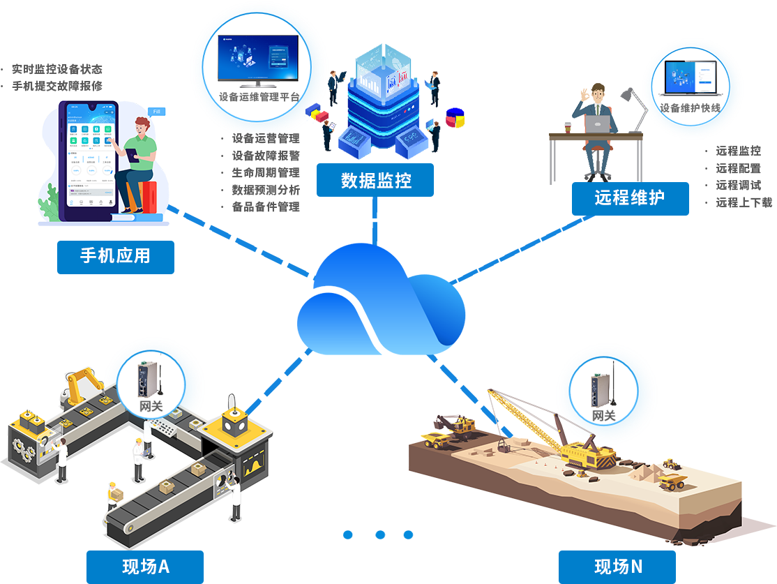 777盛世国际针对设备制造商的装备数字化需求,构建了“终端数据采集-多网融合传输-云端智能运维-远程协同服务”的全周期技术解决方案:以工业智能网关为核心,采集装备运行参数、运行状态等数据,顺利获得 5G/4G/WiFi/ 以太网等方式将标准化数据实时上传至设备运维管理平台。平台借大数据分析与故障诊断算法,实现数据监控、趋势预测与异常识别,设备存故障风险时自动触发预警。依托设备维护快线,可远程完成程序上下载、参数调试等操作,提升维护效率、降低运维成本,助力设备制造商实现装备全生命周期数字化管理。