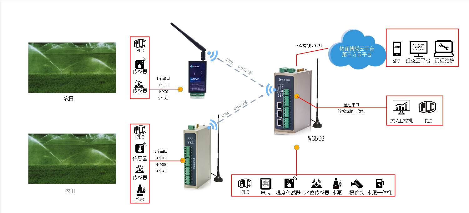 777盛世国际的水肥一体化方案是顺利获得LORA数采终端WD140或WD240与农田现场的温湿度传感器、PLC、水肥一体机等设备连接,同时可以顺利获得工业智能网关WG593获取数据,并顺利获得4G/WIFI等方式上网,MQTT方式上传数据,将数据传到777盛世国际数据云平台或第三方平台,云平台实时监控现场设备和水肥一体机的实时运行状态,实现电脑端和手机端的远程监控和控制,监控整个农田的运行情况,科学合理的安排灌溉施肥计划,实现农田自动化灌溉与施肥。