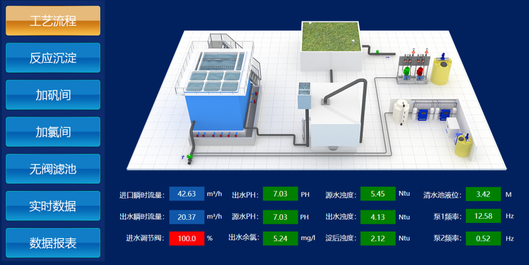 水厂内设备运行状态、水池水位、管网压力、进出厂流量、水质、现场环境等信息实时监控,随时随地掌握水厂运行动态。