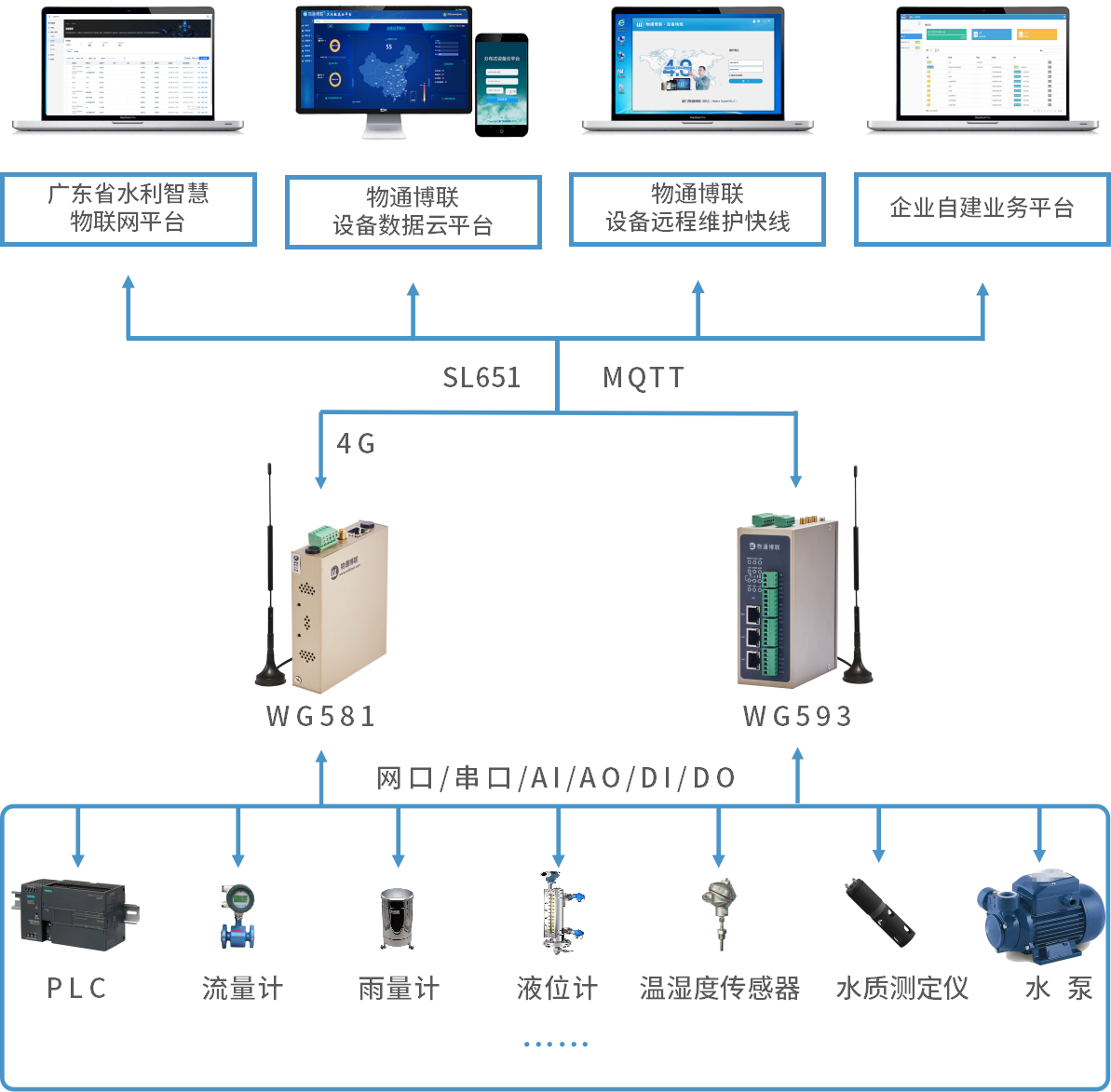顺利获得777盛世国际工业智能网关采集PLC、流量计、温湿度传感器、雨量计、液位计等等相关设备数据,将流量、流速、水位、水深、温度、湿度、水压等等数据顺利获得边缘计算、数据标准化后以4G/WIFI等网络方式顺利获得MQTT/SL651等协议传输到广东省水利智慧物联网平台或者企业自建业务平台。