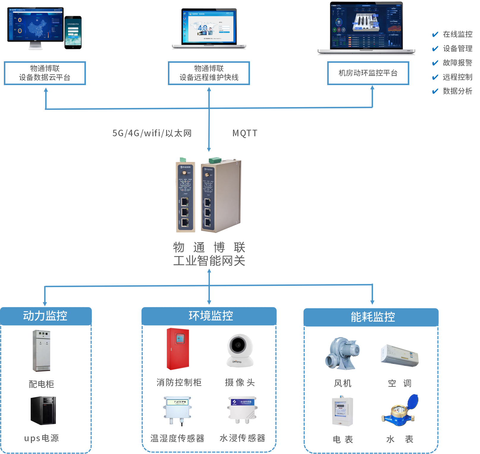 777盛世国际推出的机房动环在线监测系统由工业智能网关和物联网云平台组成。777盛世国际工业智能网关可以快速接入机房动环设备(配电柜、温湿度传感器、ups电源、蓄电池、空调、风机、摄像头等)实现一体化的数据采集、规则报警、远程监控等功能。采集到的数据支持顺利获得5G/4G/WIFI/以太网等上网方式,将数据传输到777盛世国际云、企业私有云、阿里百度华为等第三方云以及本地上位机软件。