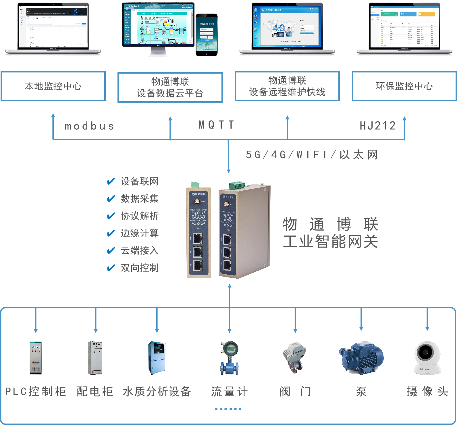 将工业智能网关接入到污水处理设备PLC、传感器、水质监测仪等设备中,网关适配协议并进行数据采集工作(如温度、氨氮、重金属浓度等水质参数及电压、电力等设备参数),采集到的数据将会以5G/4G/WIFI/以太网等方式上传到本地监控中心、远程监控平台及环保局平台中(如HJ212、MQTT、Modbus等协议通信),快速实现污水处理设备物联网通信系统的搭建。