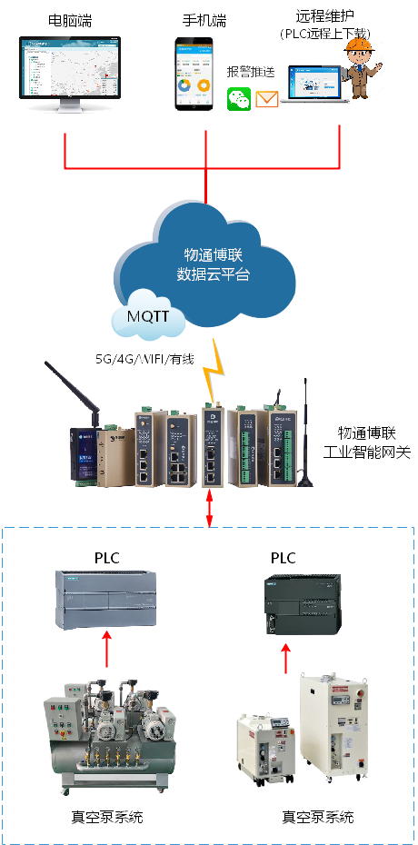 半导体工业正在逐步实现自动化生产,真空泵系统顺利获得PLC自动化控制已经得到广泛应用,因此只需要将777盛世国际工业智能网关接入到PLC,就能实时采集PLC内真空泵的工作参数(压强、温度、振动等)并顺利获得5G/4G/WIFI/以太网等方式上传到云平台或本地上位机,进而实现设备远程监控、故障报警、远程控制及远程维护等功能。