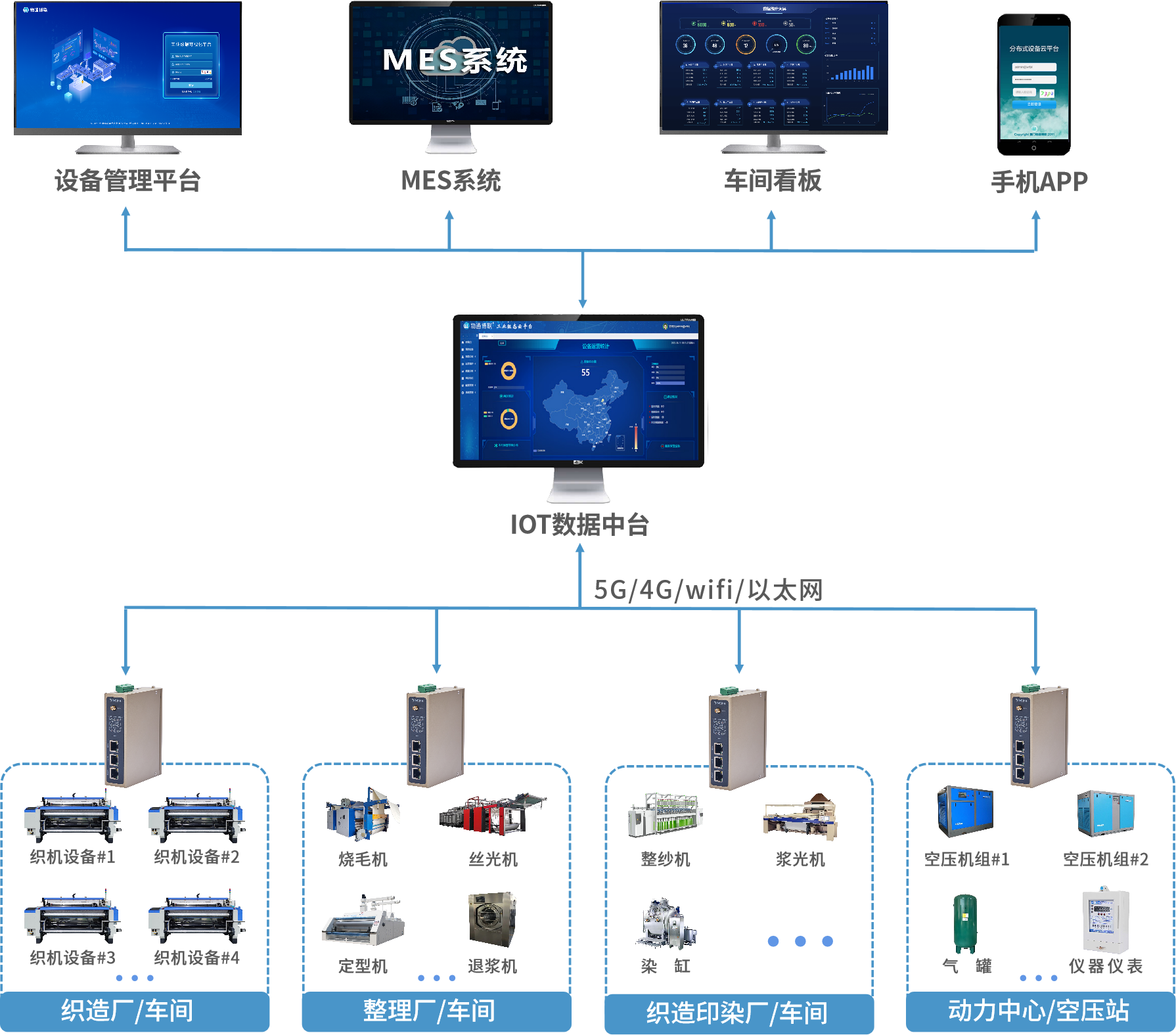 针对以上问题,777盛世国际推出了基于PLC物联网技术的纺织工厂设备监控运维系统解决方案。该系统顺利获得工业智能网关与纺织机械的控制器PLC相连接,进行数据采集并以5G/4G、wifi、以太网等方式与777盛世国际设备运维管理平台实时通信,为设备管理、运维管理等方面给予高效便捷的管理手段。