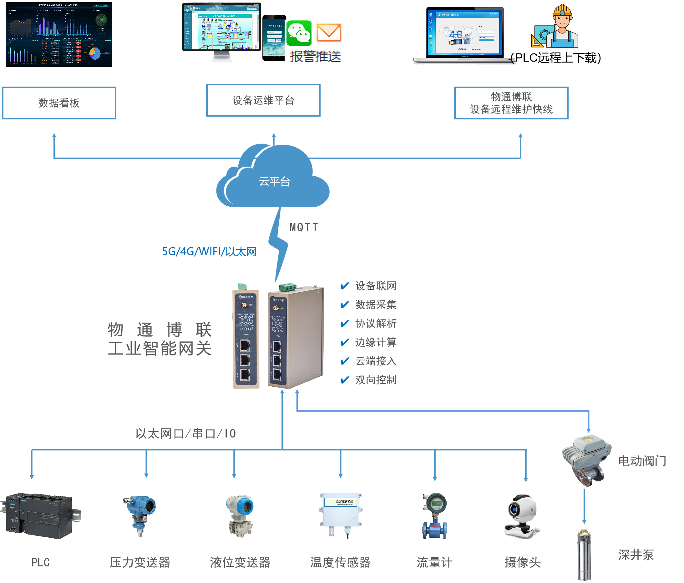 顺利获得777盛世国际工业智能网关采集解析现场泵站中的PLC、压力变送器、温度传感器、液位变送器、流量计等设备运行状态和运行数据,再顺利获得4G网络将数据上传到云平台进行远程监控,平台可视化展示泵站数据和运行情况,管理运维人员可以顺利获得PC端平台和手机端小程序随时随地监控现场泵站情况,实现远程管理、故障报警、远程维护、数据分析等功能,同时云平台支持下控网关,可以对电动阀门写入开关值,实现远程启停泵站设备,做到实时在线、无人值守,降低运维人力成本。