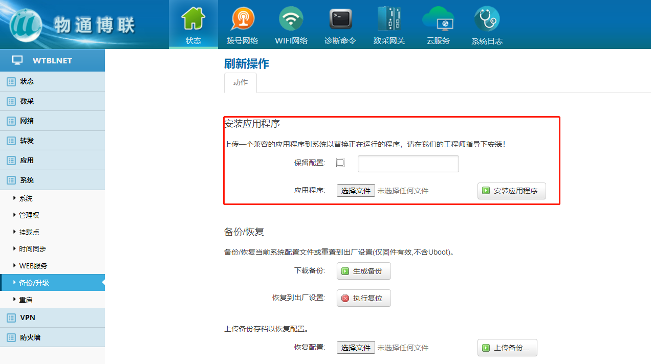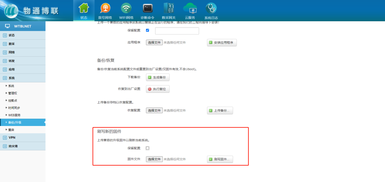 下载中心 视频中心 常见问题 售后服务 工业网关 设备快线 数据云平台 联网设备 问答百科 工业智能网关如何更新程序和固件? 时间:2022-10-26 09:39:53 点击:5156 关键词:工业智能网关,网关配置,固件升级 问题:工业智能网关如何更新程序和固件? 回答: (1)固件升级:后缀为。bin的文件 点击系统—备份/升级—选择文件—刷写程序(不保留配置) (2)IPK文件升级:后缀为。ipk的文件 点击系统—备份/升级—选择文件—输入密码—安装应用程序(不保留配置) 上一篇:工业智能网关时间如何进行同步? 下一篇: 工业智能网关如何连接wifi热点?