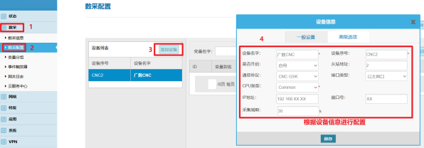 4.常见问题 4.1、网络不通:重启设备、检查网线、检查网口灯是否闪烁 4.2、版本低:尝试升级数控系统 3 网关数采配置 1.数采配置 根据CNC设备情况及信息配置后保存。