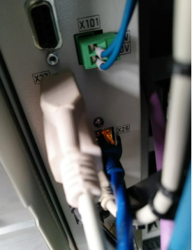 此系统为:M70控制器 还有一种情况是面板无任何版本信息,这时就需要进入系统里面再确认。 1. 确认通讯接口 打开电器柜后既可看到网口。编号X26