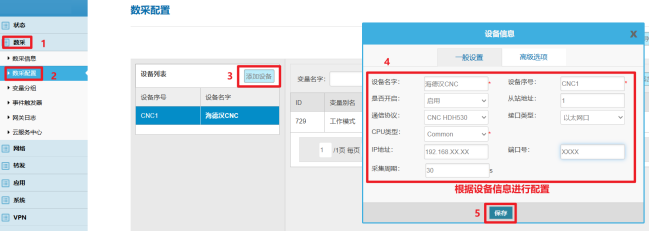 3 网关数采配置 1.设备配置 根据CNC设备情况及信息配置后保存。