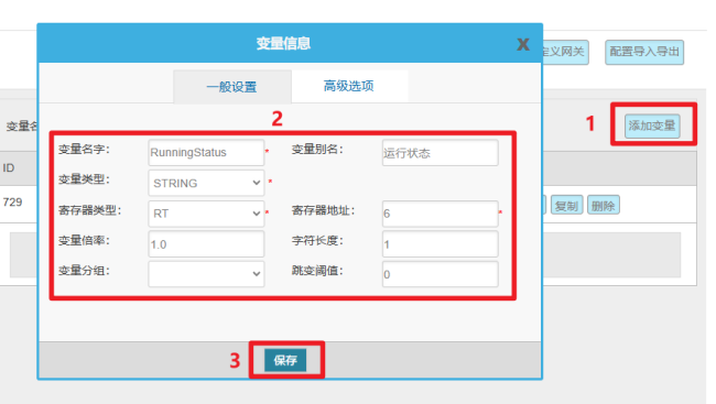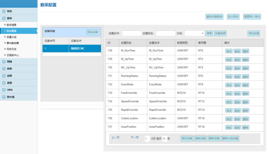 注意:数采网关LAN口地址必须与CNC IP处于同一网段且不冲突,保证网关可以Telent通CNC (IP与端口)。如果Telent不通,可查看本手册第28页“3.网关与CNC同网段配置”。 2.变量配置 变量配置主要是定义变量名(自定义内容,不可使用中文命名)、变量别名(自定义,可使用中文名字)、寄存器类型和寄存器偏移地址,并定义一些数据规则(如:倍率、小数点、单位、告警)。