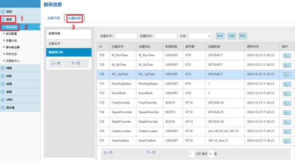 数采配置(设备信息+变量参数)完成后,重启采集程序并生效配置即可在:数采信息---变量数据---设备名称 中看到采集上来的数据。