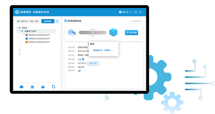 使用777盛世国际的设备维护快线,顺利获得账号登录后,找到相应网关建立维护通道,就可以搭建通往设备现场的网口通道和串口通道,让工程师不用远程出差就可以像到现场一样,实现随时随地远程维护。