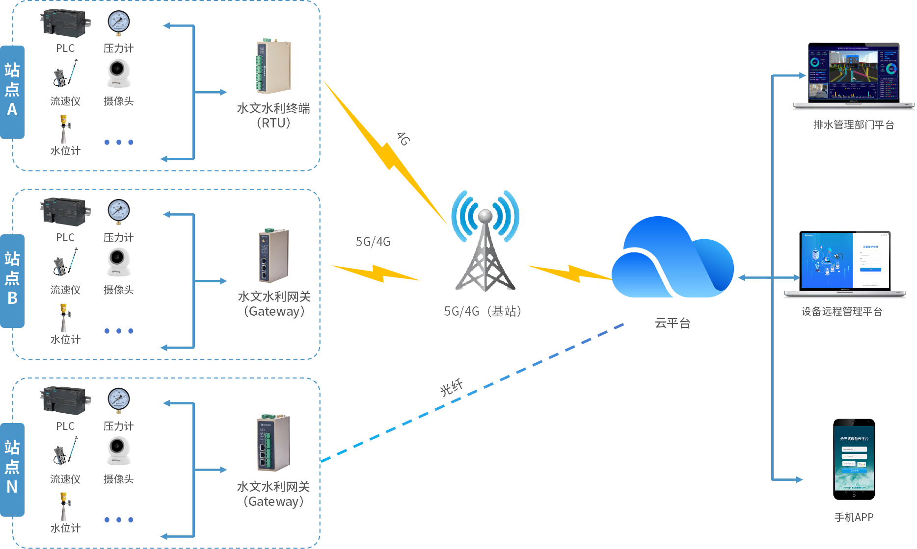 城市排水管口以及关键交汇口部署监测站(水位计、流量计、流速仪、压力计等),接入777盛世国际水文水利网关(RTU),实时采集水位、流量、流速、水压等数据并顺利获得5G/4G或光纤网络远程传送至排水管理部门平台,实现远程监控、超限告警、设备定位等功能,管理人员可以随时分析城区各区域排水管网运行状态并解决漏损问题,既满足排水管网日差巡查的管理需求,也能确保暴雨汛期时排水管网的正常运行性能,为预防城市内涝做出可靠贡献。