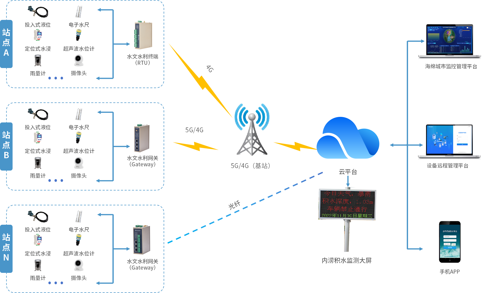 实时监测水位、液位高低、雨量、流速等参数,可设置监测频率,24小时不间断运行,可以顺利获得手机端、PC端、数据大屏等实时监测城市内涝积水状态和视频画面。