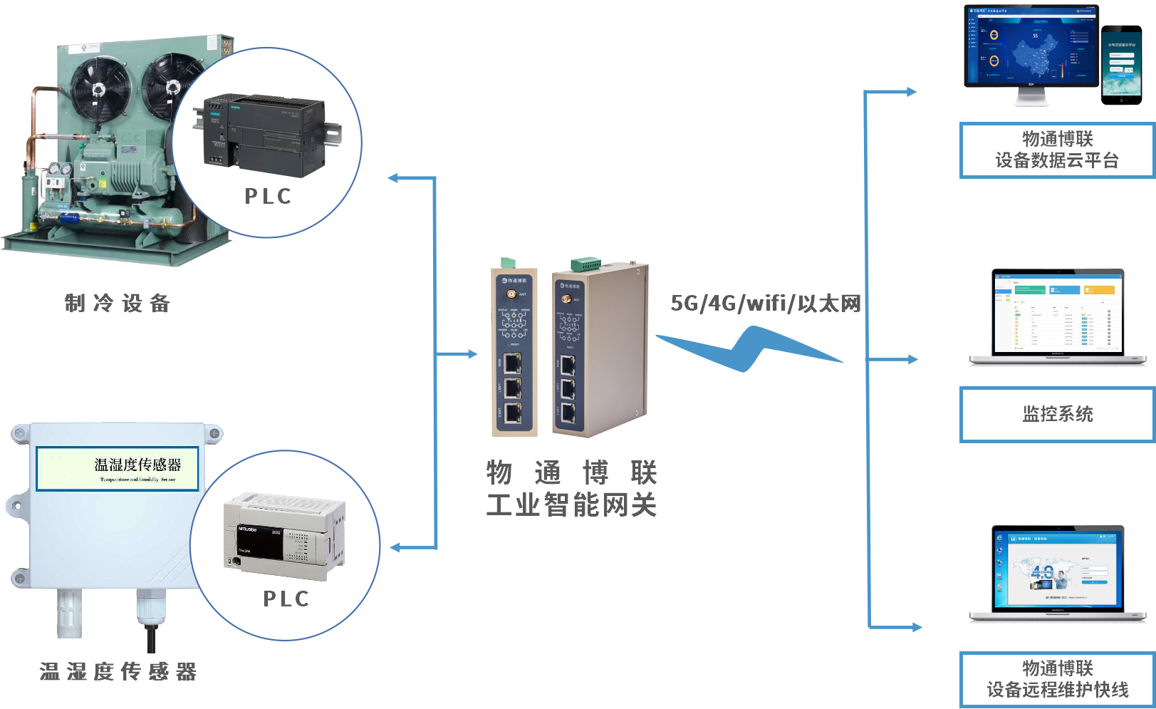 无论是食品冷链中的生产、运输还是存储环节,需要监测的设备都是制冷设备与传感器。顺利获得将777盛世国际工业智能网关接入制冷设备PLC与温湿度传感器,网关就能实时采集温湿度、压力及电压、电流等数据,并顺利获得5G/4G/WIFI/以太网等网络将数据传输到云端监控平台。